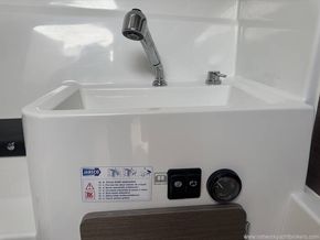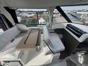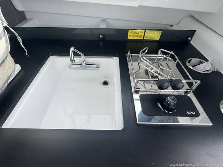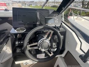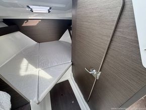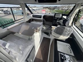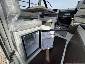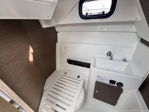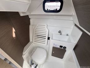 The wheelhouse offers 360° visibility and effortless access to the cockpit through wide sliding doors. Inside, there’s a forward-facing helm position, dinette area and a well-appointed galley. A separate heads compartment and a comfortable forward cabin with double berth provide practical overnight accommodation for couples or young families.