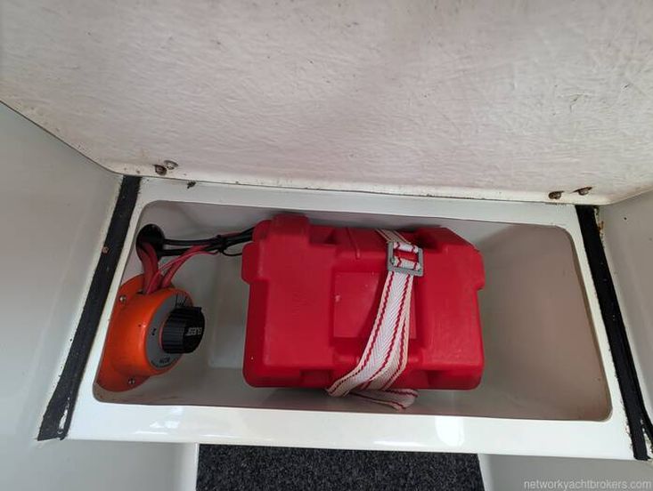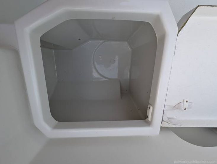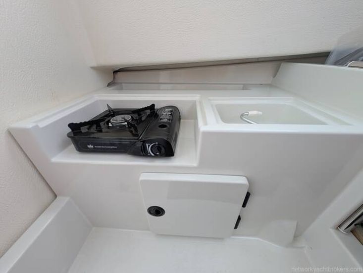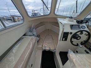 The accommodation is thoughtfully laid out, with a compact galley to port featuring a camping stove and sink, complemented by useful storage and a small water tank below.To starboard is the helm station with seating, offering good visibility and a practical driving position.Forward, the boat benefits from a double berth with infill, with a neatly stowed Jabsco toilet located beneath the berth.